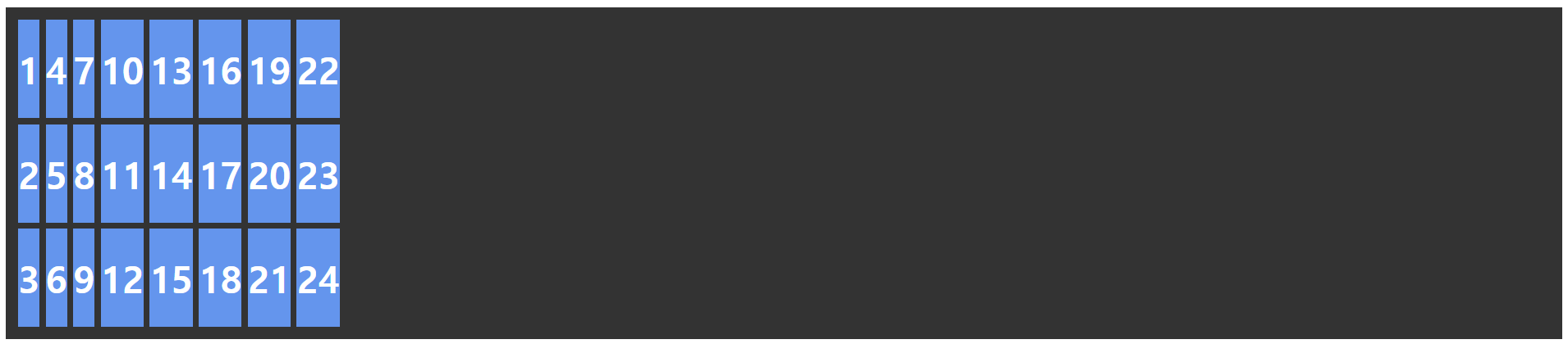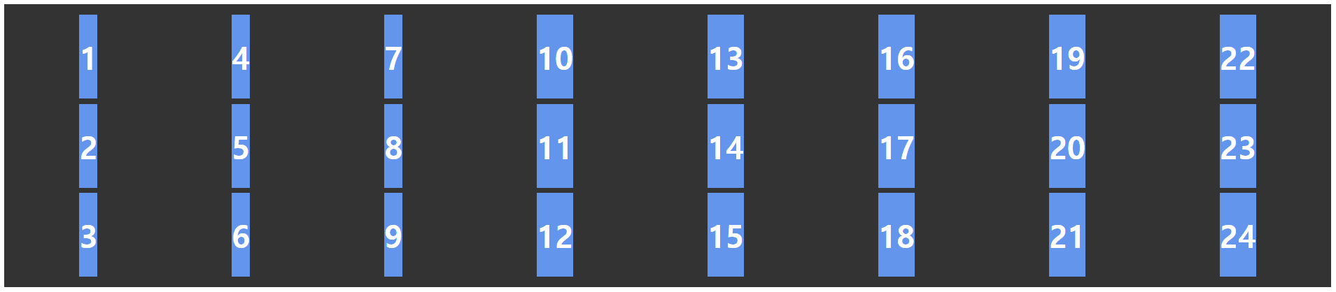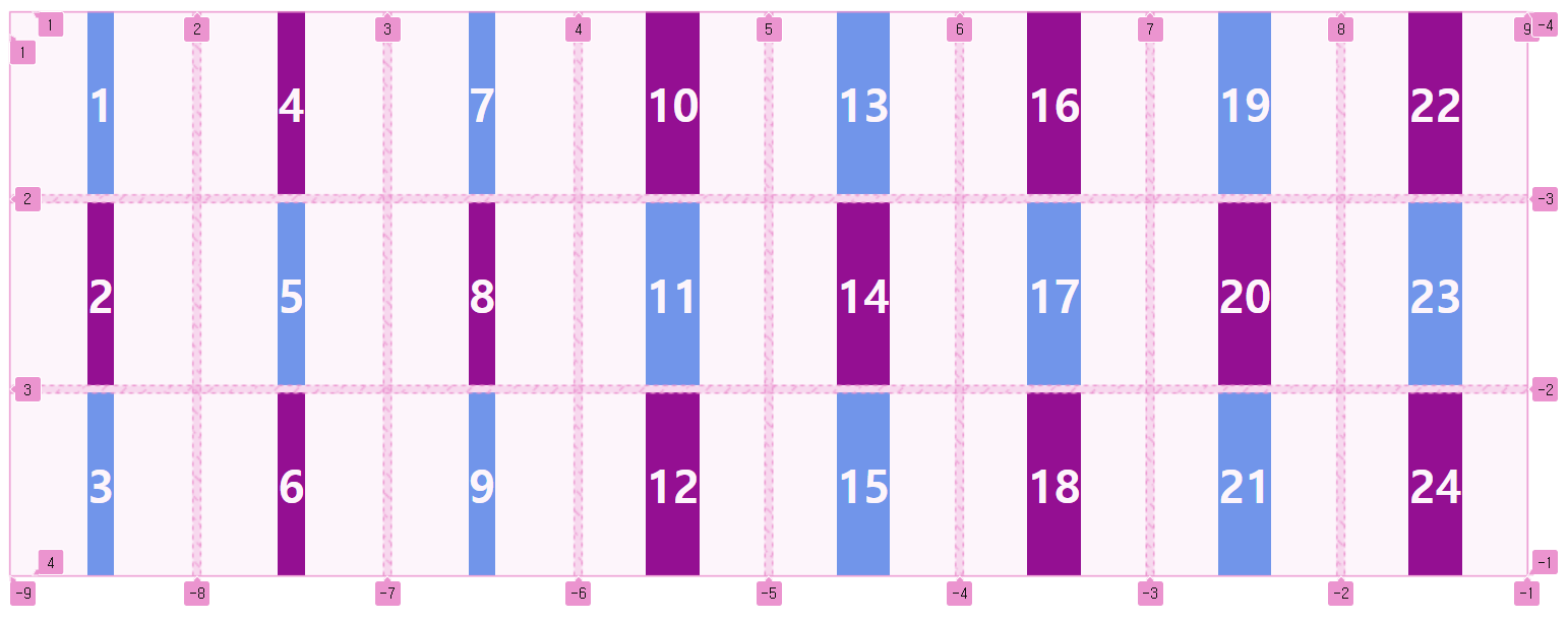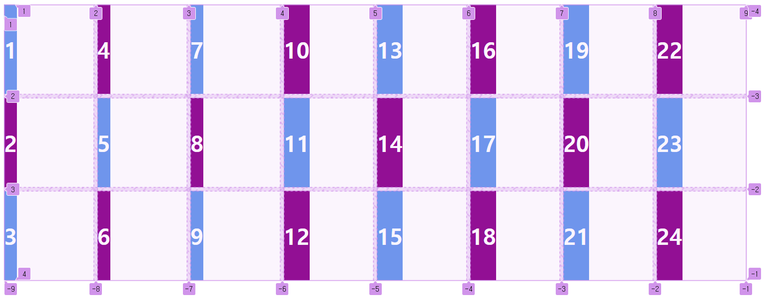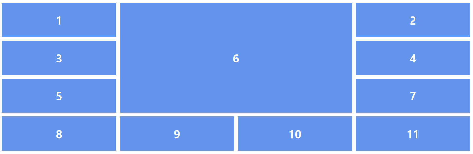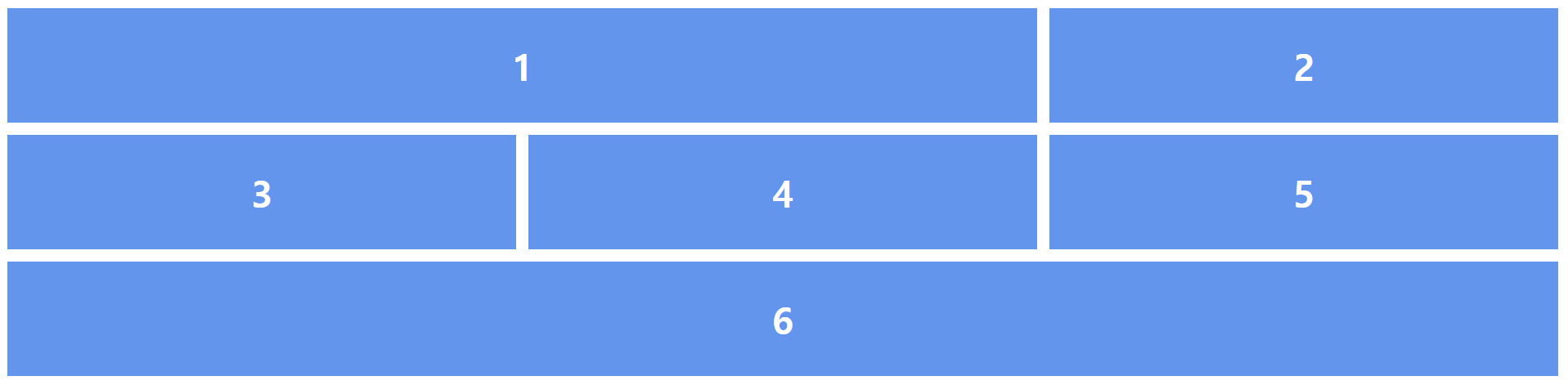 .container { display: grid; grid-template-columns: repeat(3, 1fr); } .item1 { /* 1번 라인에서 2칸 */ grid-column: span 2; } .item6 { /* 1번 라인에서 3칸 */ grid-column: span 3; }