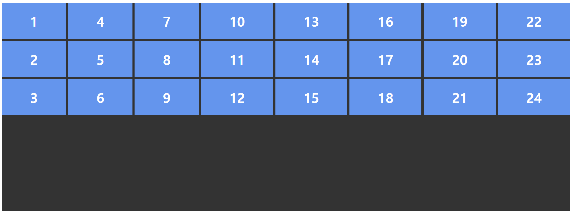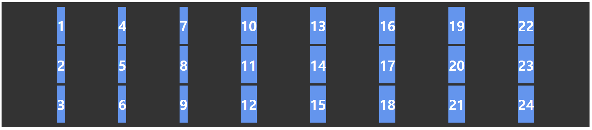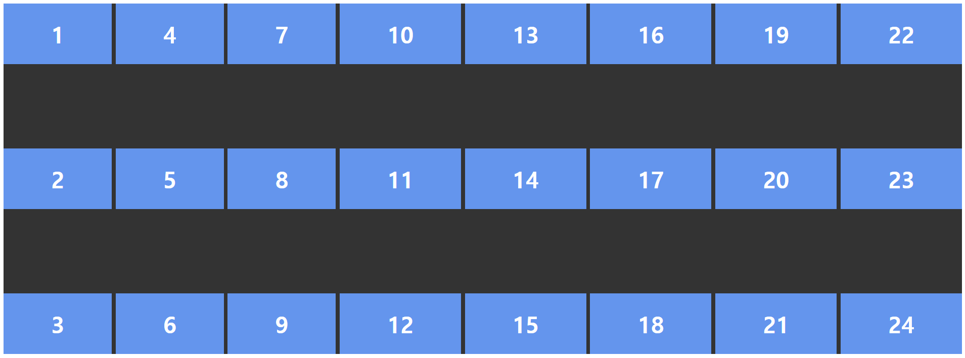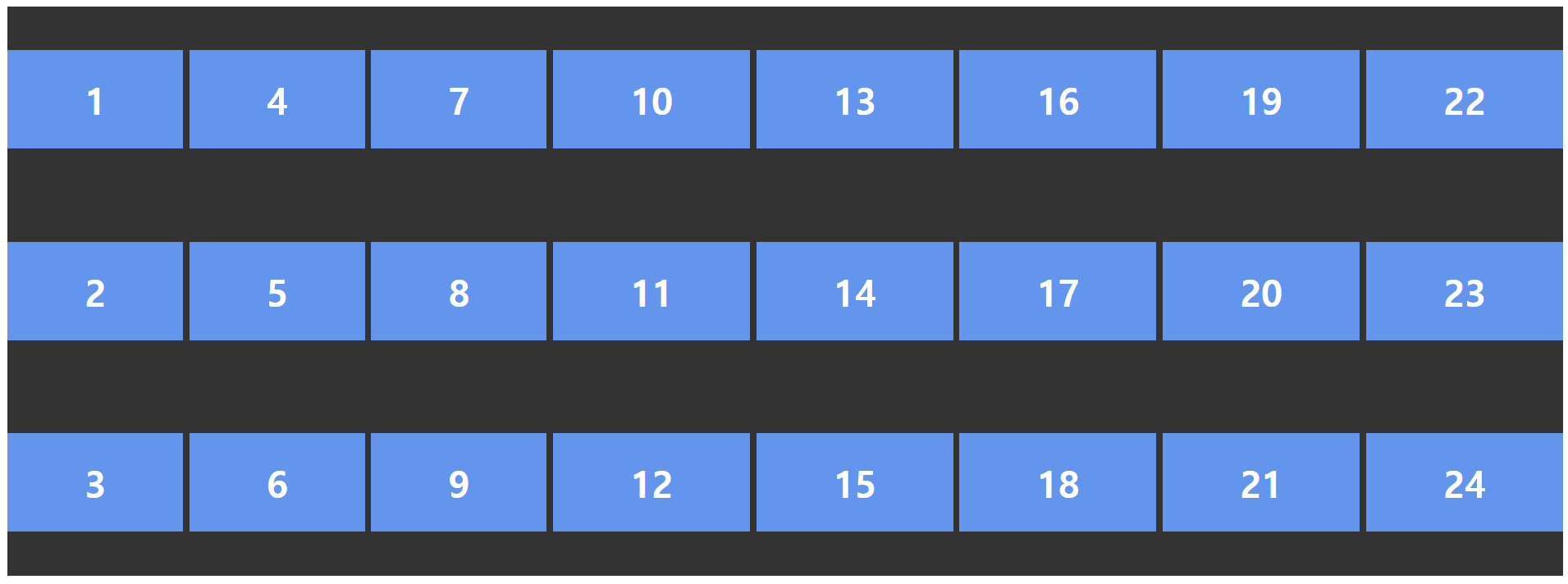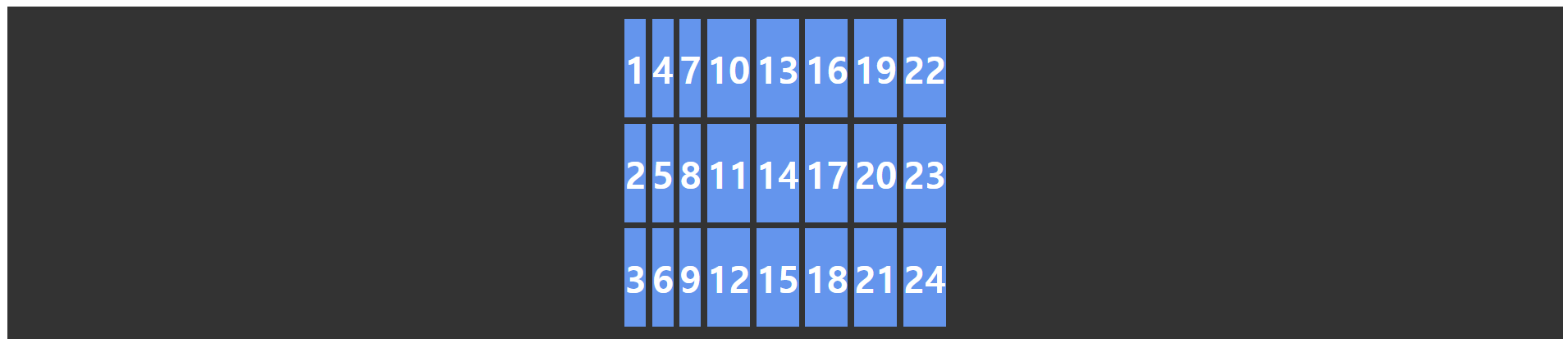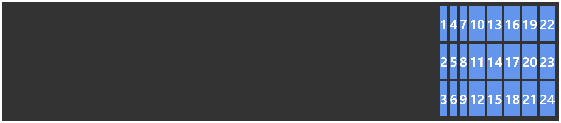 .container { display: grid; grid-template-columns: repeat(3, 1fr); } .item1 { /* 1번 라인에서 2칸 */ grid-column: span 2; } .item6 { /* 1번 라인에서 3칸 */ grid-column: span 3; }