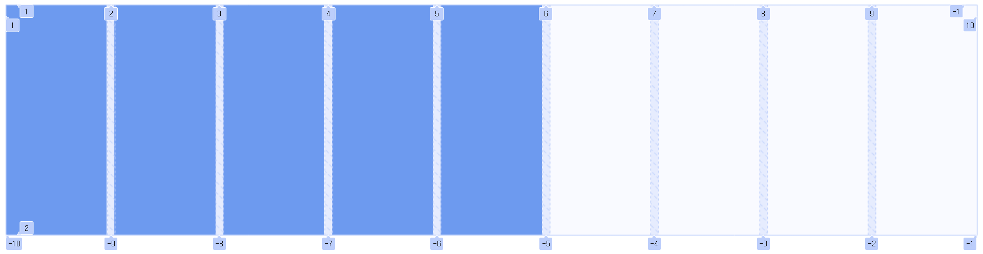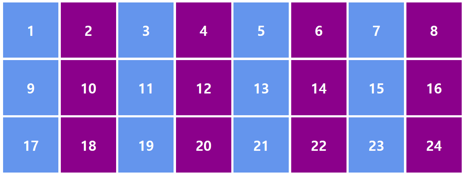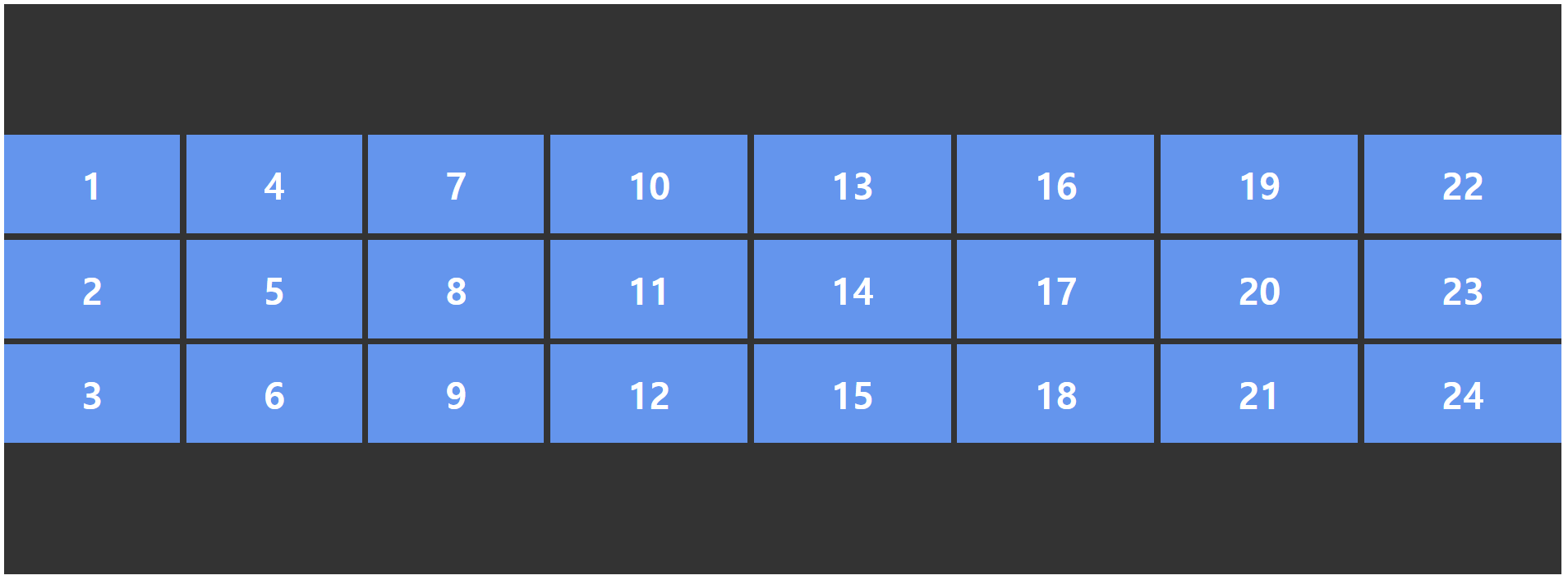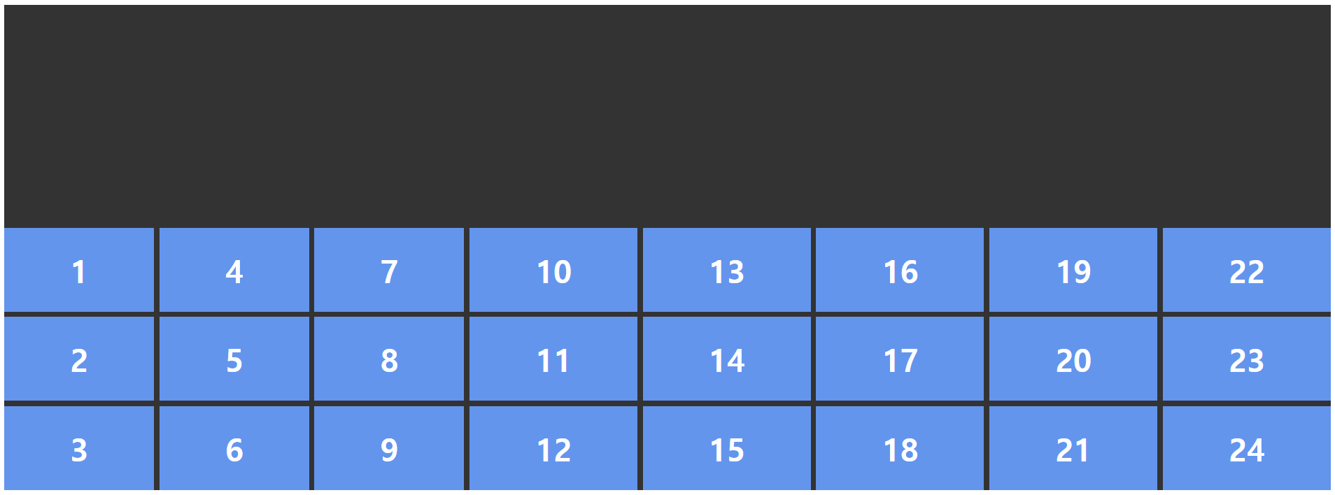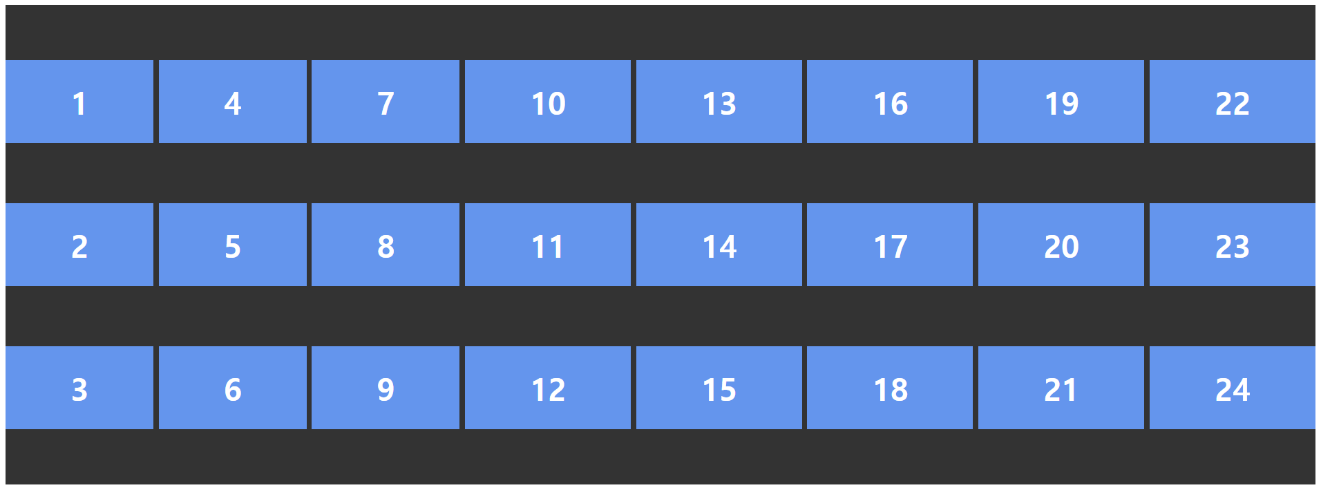 .container { display: grid; grid-template-columns: repeat(3, 1fr); } .item1 { /* 1번 라인에서 2칸 */ grid-column: span 2; } .item6 { /* 1번 라인에서 3칸 */ grid-column: span 3; }
