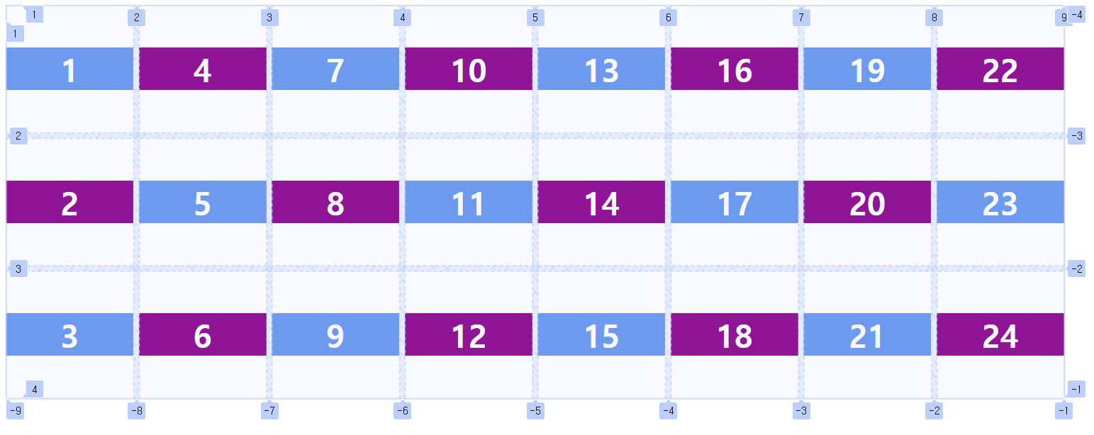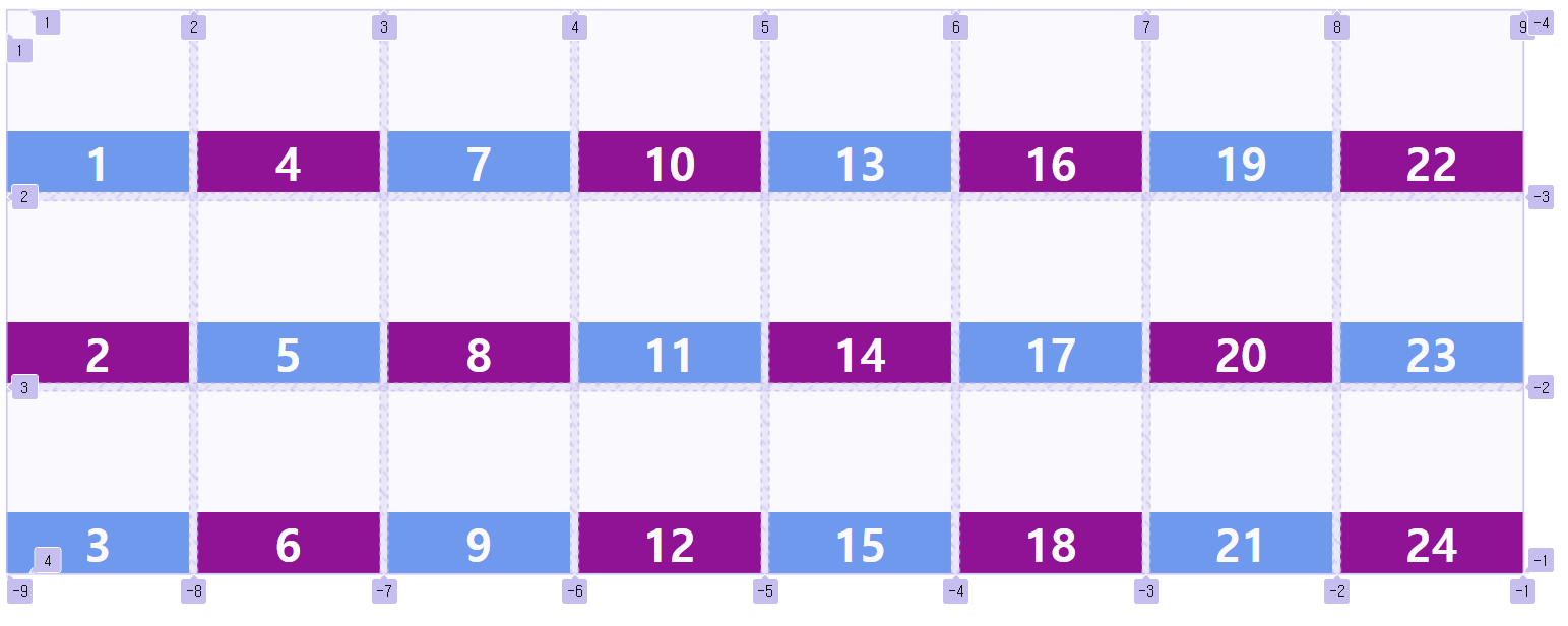 grid-auto-flow: column방향 grid-auto-flow가 row와 column 따라 기준이 달라지는 걸 볼 수 있습니다.