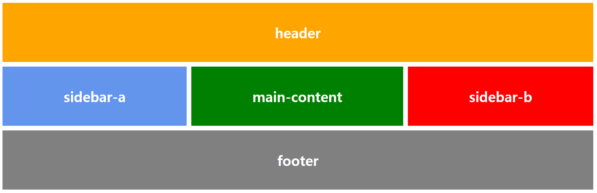 .header { grid-area: header; } .sidebar-a { grid-area: a; } .main-content { grid-area: main; } .sidebar-b { grid-area: b; } .footer { grid-area: footer; }